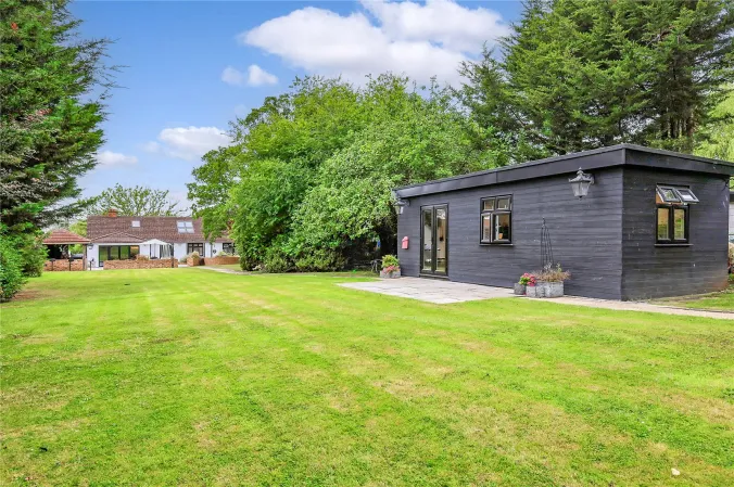 A stylish detached country residence set on a plot of approx. one acre backing onto open countryside in sought-after Little Warley. The property is approached by dual entrance gates and offers ample parking and access to the integral garage. The property is beautifully presented offering four double bedrooms, two bathrooms and a stunning kitchen/family room with bi-folding doors plus a separate reception room. The gardens feature a sun terrace, seating areas and bespoke bar/outdoor kitched creating a wonderful entertaining area with a firepit. There is a detached workshop providing ideal ‘work from home’ studio space with services connected (kitchenette and shower room). In addition there is a further detached Gym with bar, accessed from the garden.